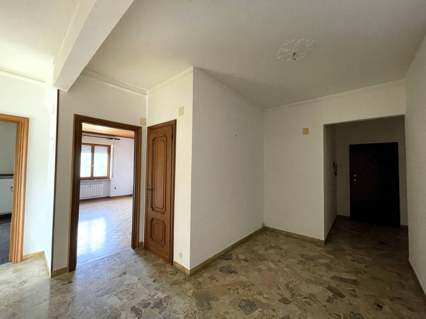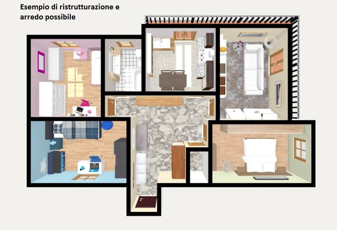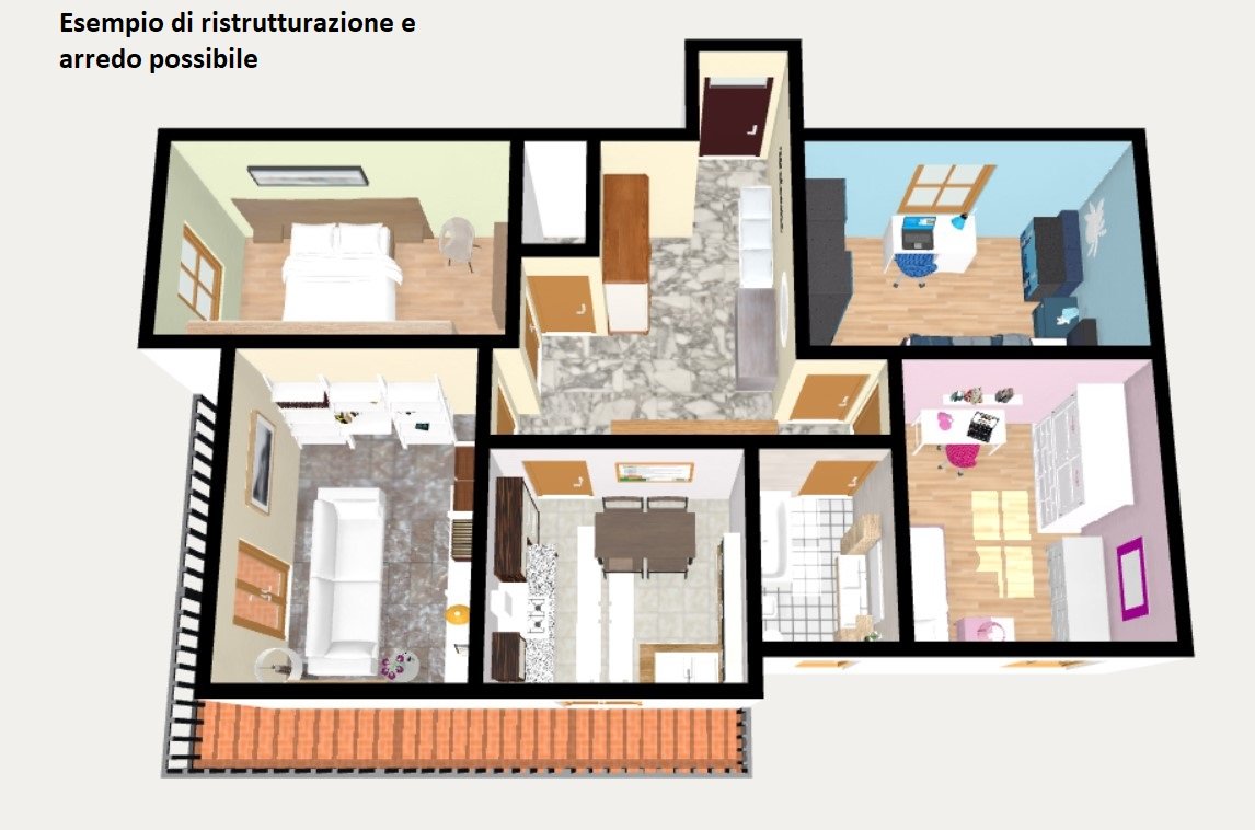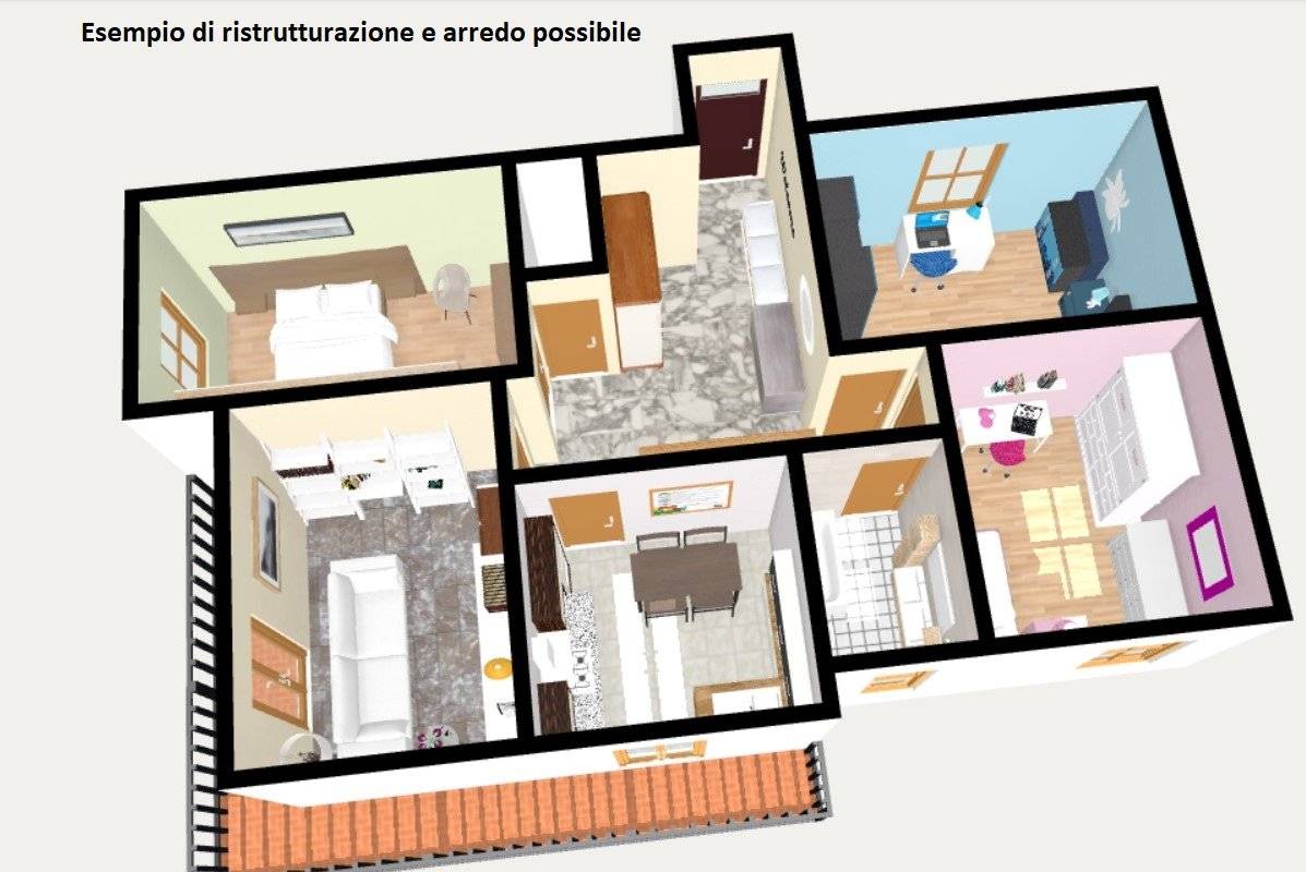 Entrando ci accoglie un ampio ingresso arredabile, che conduce a tutti gli ambienti della casa; la cucina abitabile e il soggiorno hanno accesso all'ampia balconata presente.