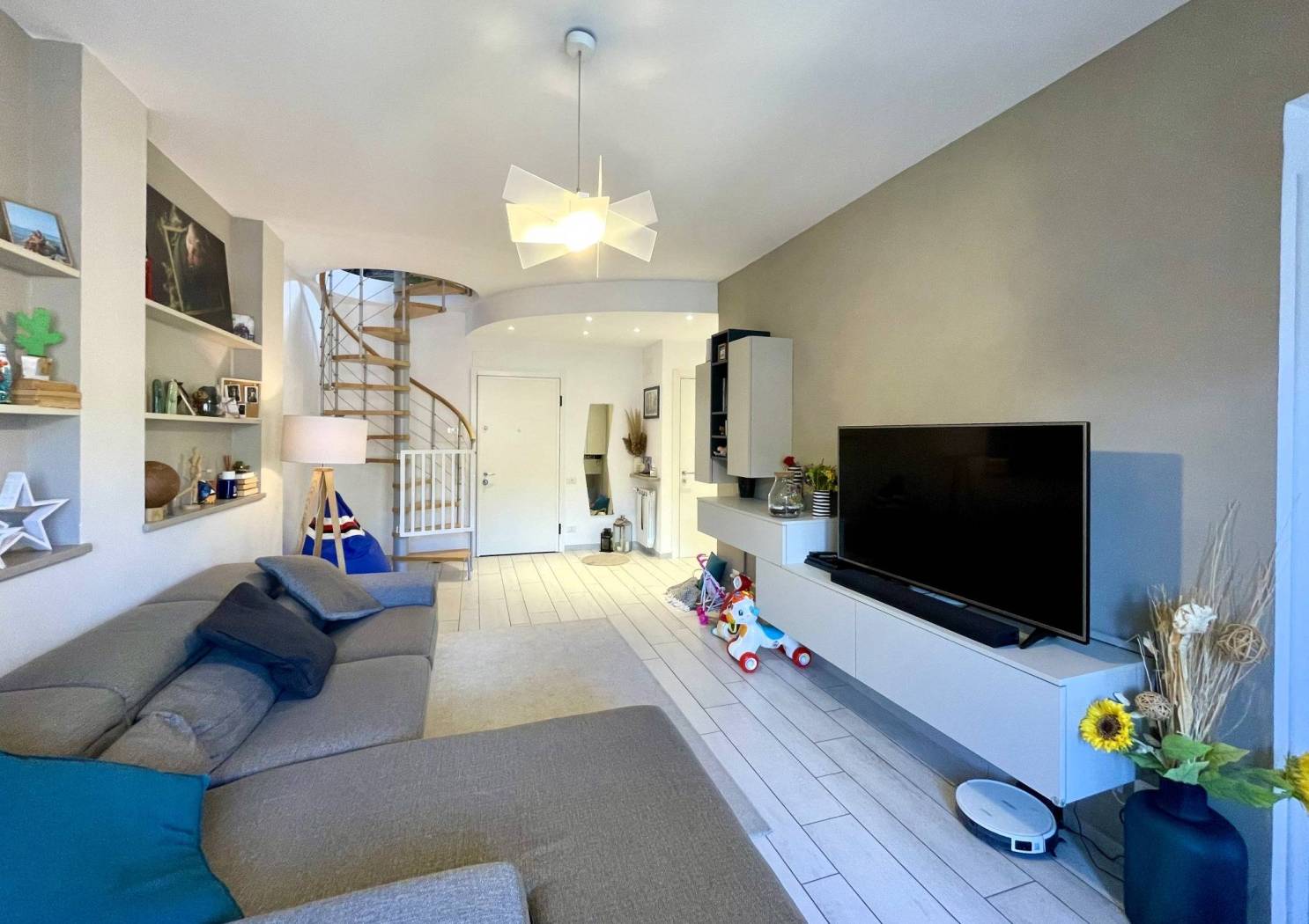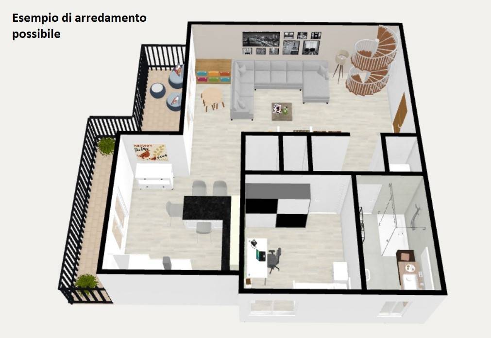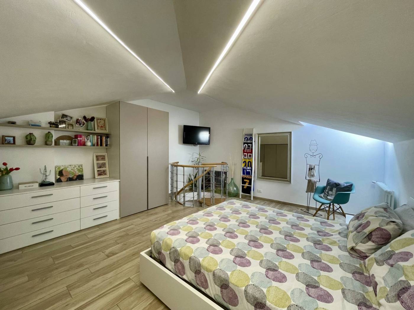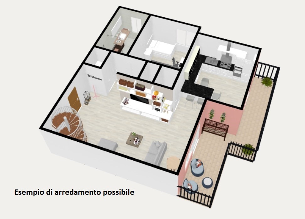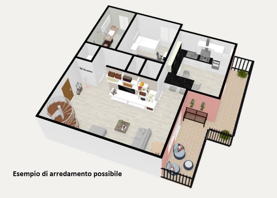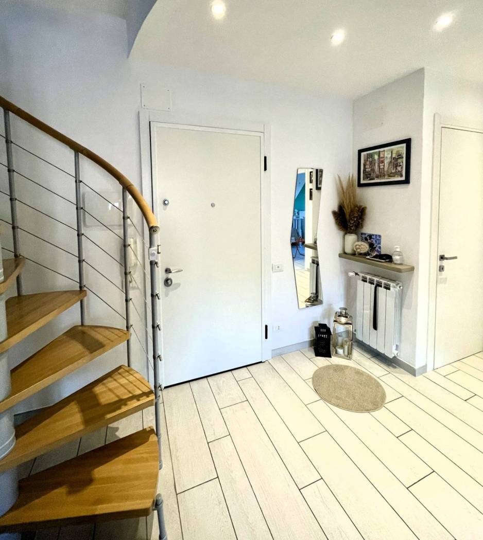 Di recente ristrutturazione, si presenta in ottimo stato e subito abitabile. Disposto su due livelli abitativi è così composto; ingresso su ampio salone con cucina abitabile a vista, camera da letto, bagno con box doccia e tre comode dispense. E' presente anche una balconata alla quale si accede da cucina e soggiorno. Al secondo piano, raggiungibile con scala a chiocciola dal soggiorno, troviamo la camera da letto matrimoniale, semimansardata e dotata di climatizzatore caldo/freddo. Da qui si accede inoltre all'ampio locale sottotetto ad uso ripostiglio. Tutti gli infissi sono nuovi in PVC con doppio vetro completi di zanzariere; la porta di ingresso è blindata.