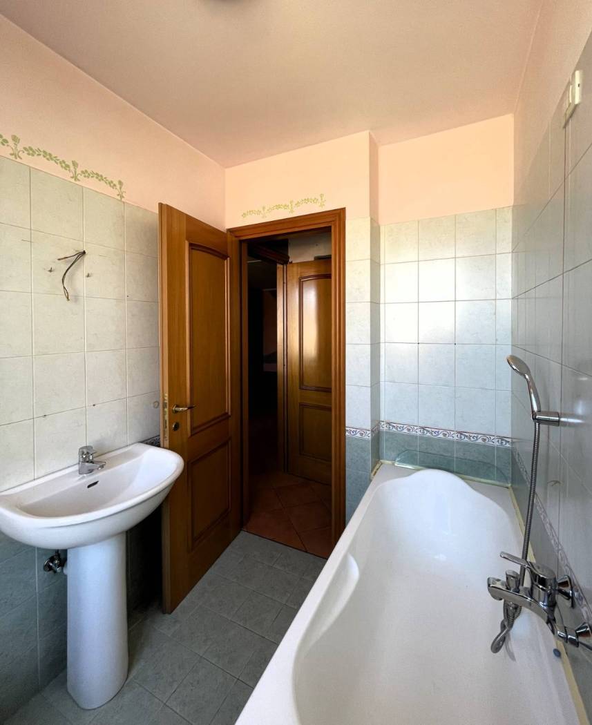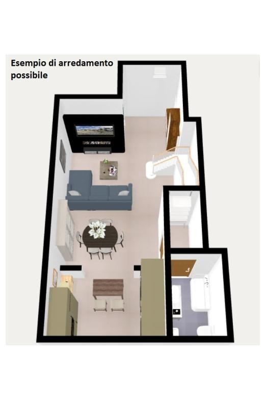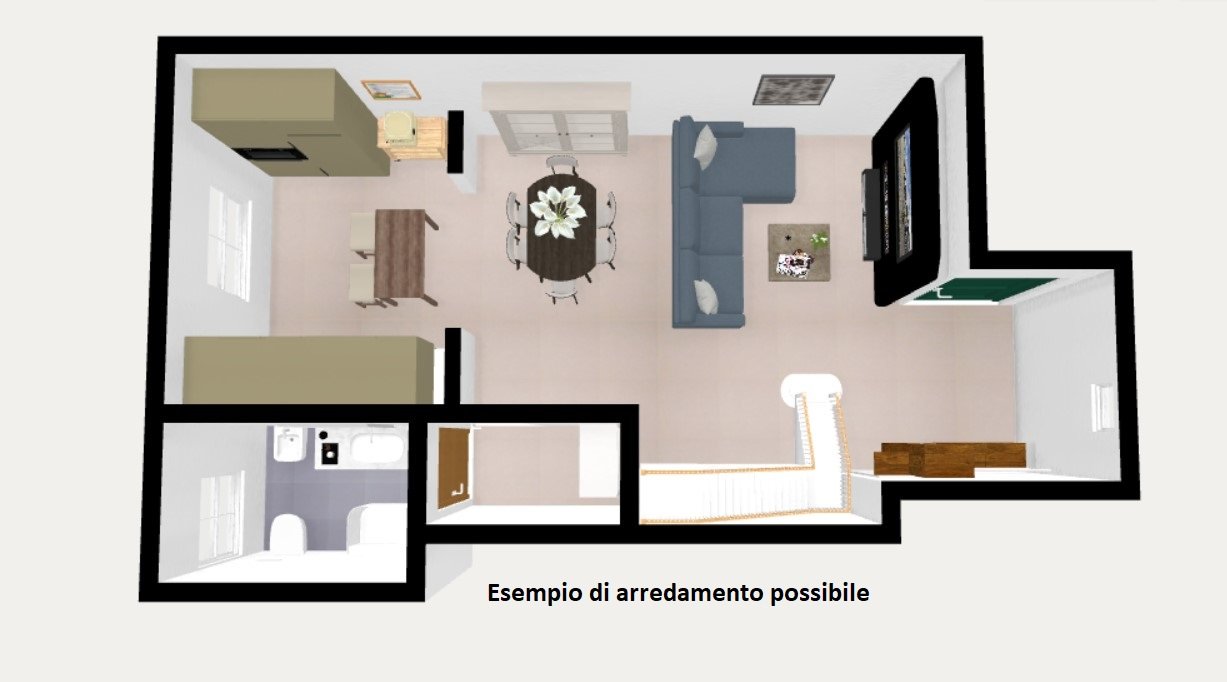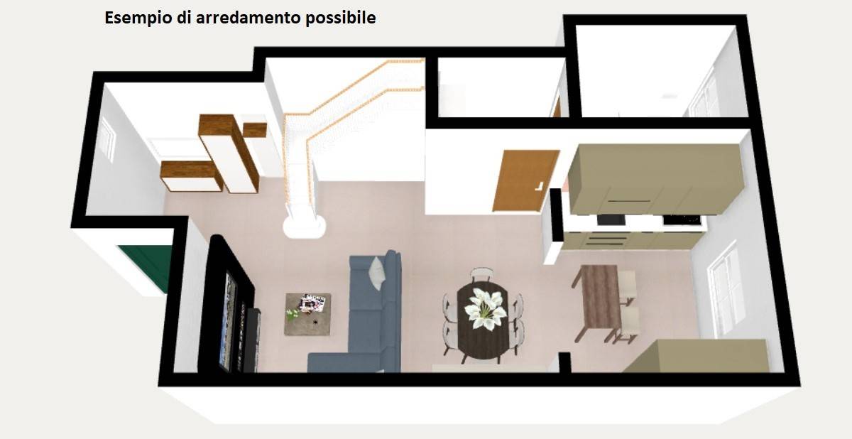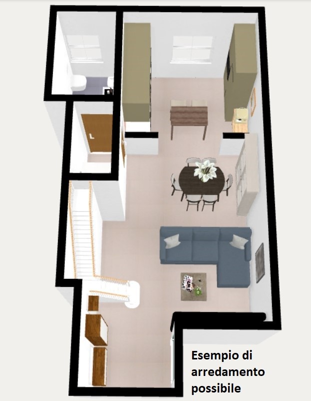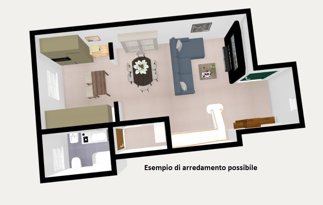 In ingresso troviamo la zona giorno con cucina a vista adiacente al soggiorno. Il bagno a questo piano è dotato di vasca da bagno e finestra, con adiacente il sottoscala utilizzabile come ripostiglio.
