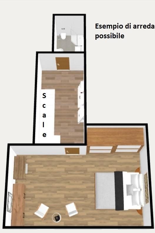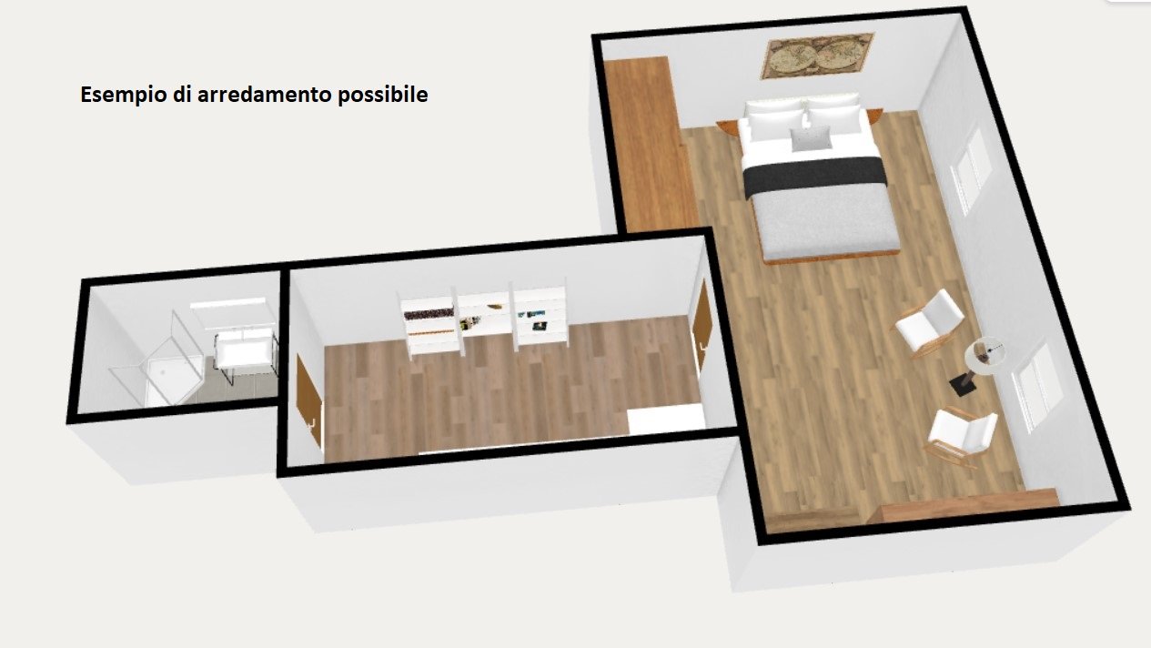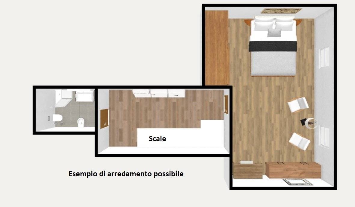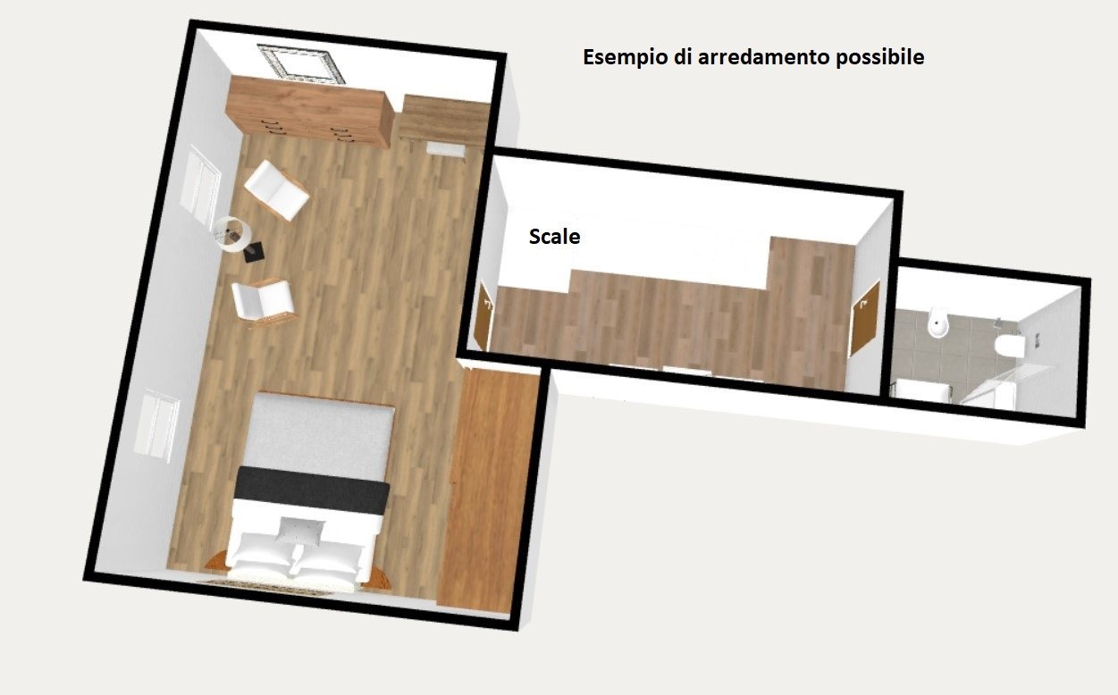 Salendo al piano superiore troviamo la zona notte, composta da una camera da letto matrimoniale di generose dimensioni. Anche a questo piano troviamo un bagno dotato di box doccia.
